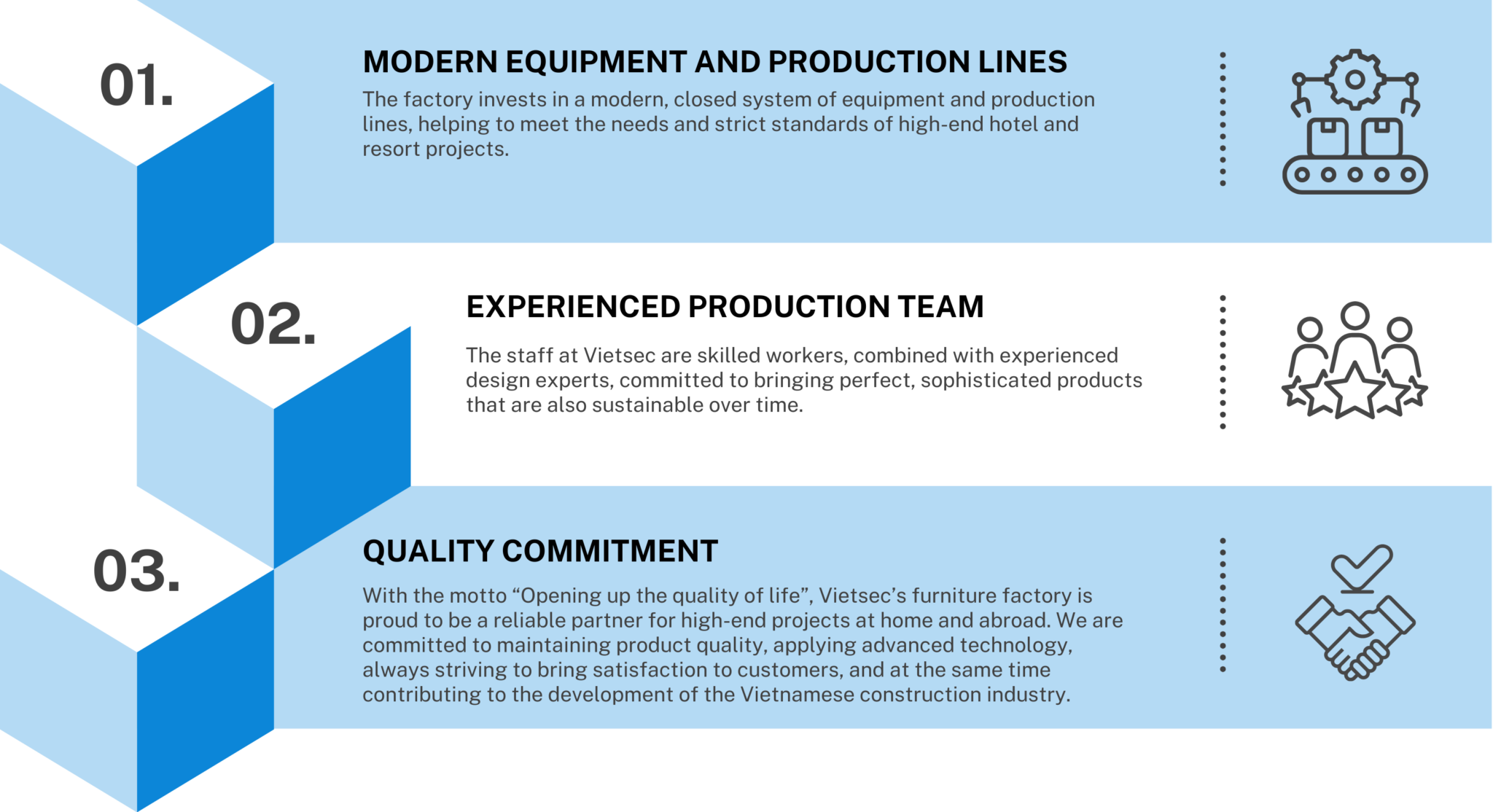 Equipped with modern production lines, advanced technology applications and a comprehensive digital management system, Vietsec’s aluminum and glass factory not only optimizes performance but also ensures international quality standards. A team of skilled engineers and technicians is the core factor that helps Vietsec confidently conquer high-end projects.